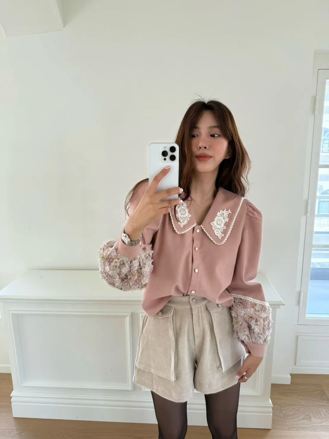 H22刺繡藝術拼接蕾絲袖襯衫(3色)