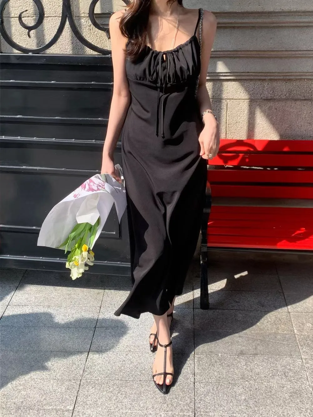 H270貝拉少女抓皺綁帶細肩洋裝(2色)