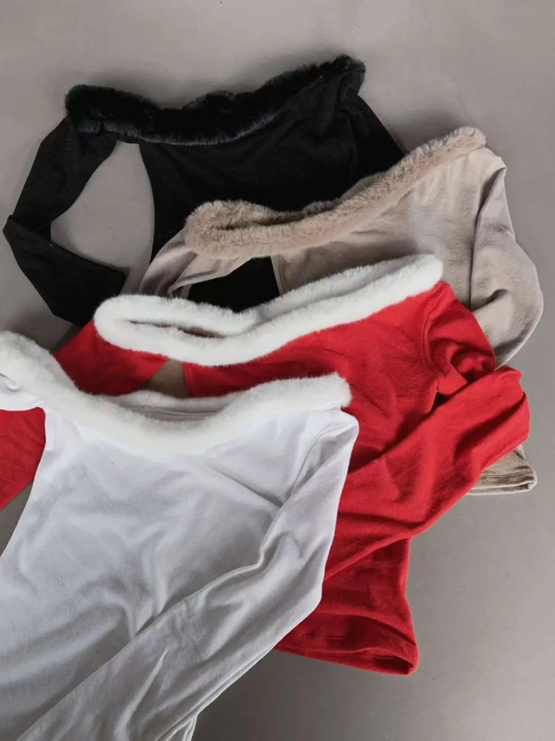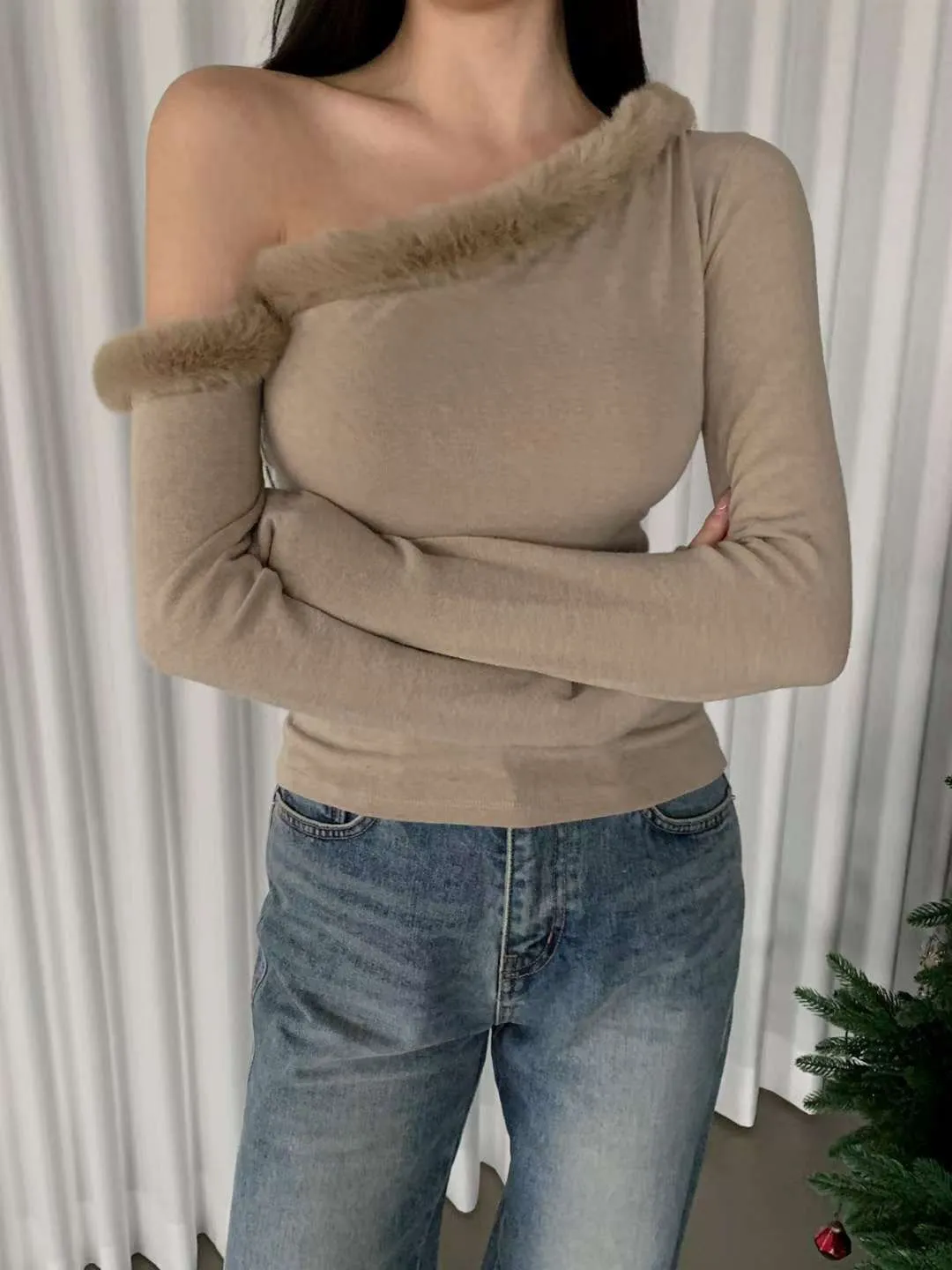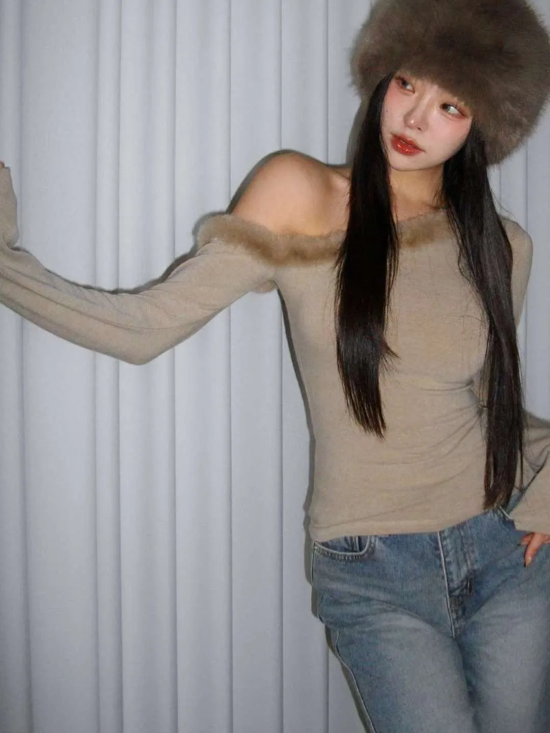 H111美式水貂毛一字斜肩貼身上衣(4色)